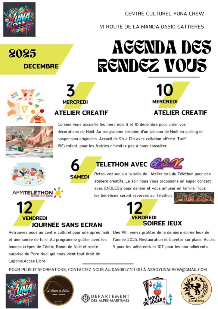 Agenda des rendez-vous Centre culturel Yuna Crew – Décembre 2025 – PLus d’infos 06 50 85 77 41 / assoyunacrew@gmail.com