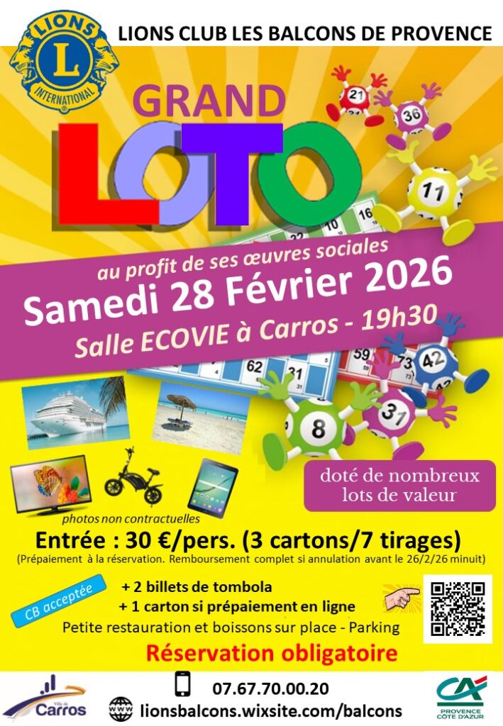 Grand loto caritatif organisé par le Lions club Les balcons de Provence, Samedi 28 février, à 19h30 – Salle Ecovie – Carros
