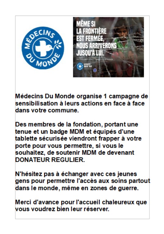 L’objectif de notre campagne est d’aller directement à la rencontre des habitants, à leur domicile, afin de les sensibiliser aux actions et aux missions de MDM, et de leur proposer, s’ils le souhaitent, de soutenir l’association par un don régulier. Aucune collecte d’argent liquide ou de chèques ne sera effectuée, et aucune distribution de tracts ou prospectus n’est prévue.