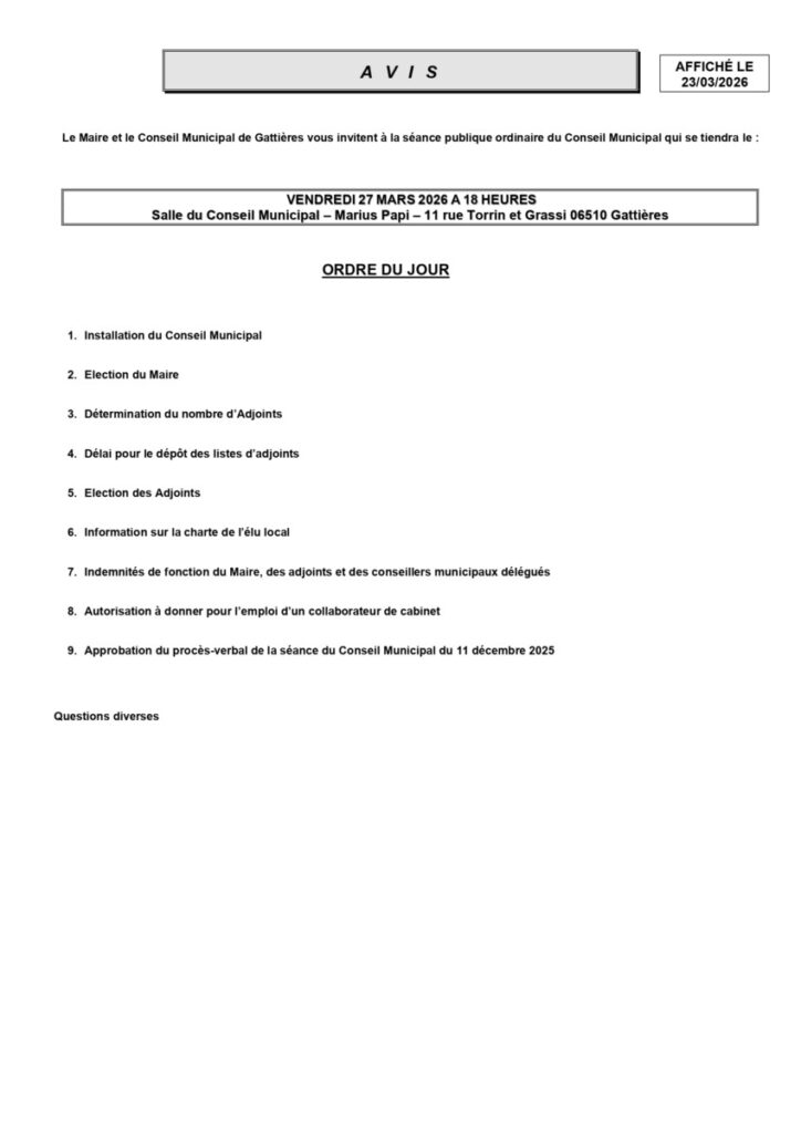 Avis du Conseil municipal du vendredi 27 mars 2026 à 18h – Salle du Conseil municipal Marius Papy, 11, Rue Torrin et Grassi, Gattières