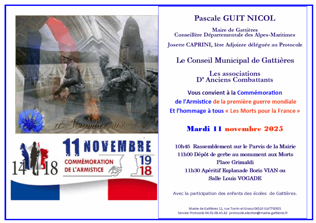 Mardi 11 novembre Avec la participation des écoliers de Gattières. Renseignements Service Protocole 04.92.08.45.82 protocole.election@mairie-gattieres.fr