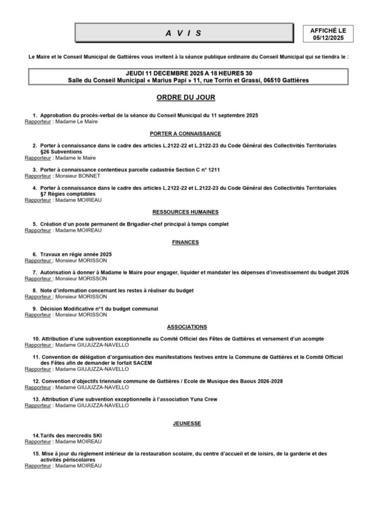 Avis du conseil municipal du Jeudi 11 Décembre 2025 à 18h30 – Salle du conseil Marius Papi