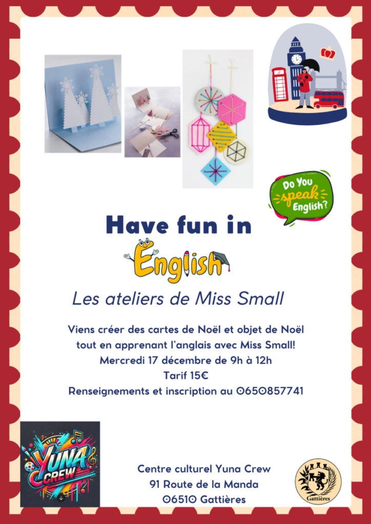 Accueil › Actualités › Have fun in English – Les ateliers de Miss Small Mercredi 17 décembre de 9h>12h- Création de cartes de Noël en apprenant l’anglais – Inscriptions au 06 50 85 77 41 Centre culturel Yuna Crew