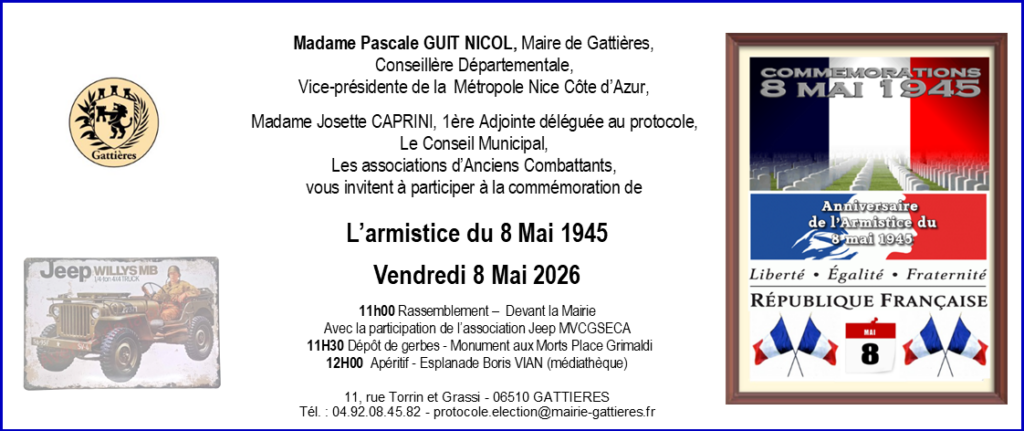 Accueil › Actualités › Invitation à la commémoration de l’armistice du 8 Mai 1945 – Vendredi 8 mai 2026 – 11h Rassemblement devant la mairie – 11h30 Dépôt de gerbes au Monument aux Morts – 12h Apéritif Esplanade B. Vian