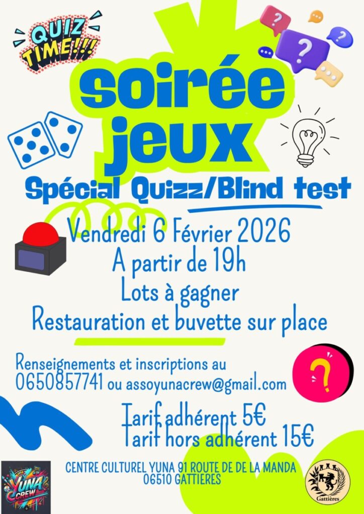 Soirée jeux – Spécial Quizz/Blind test – Vend. 6 février à partir de 19h – Lots à gagner – Restauration et buvette 06 50 85 77 41 Yuna Crew