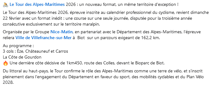 Accueil › Actualités › Tour des Alpes 2026, dimanche 22 février – Course cycliste organisée par Nice Matin en partenariat avec le Département des Alpes-Maritimes – L’épreuve reliera Villefranche-sur-Mer à Biot sur un parcours de 162.2 km.
